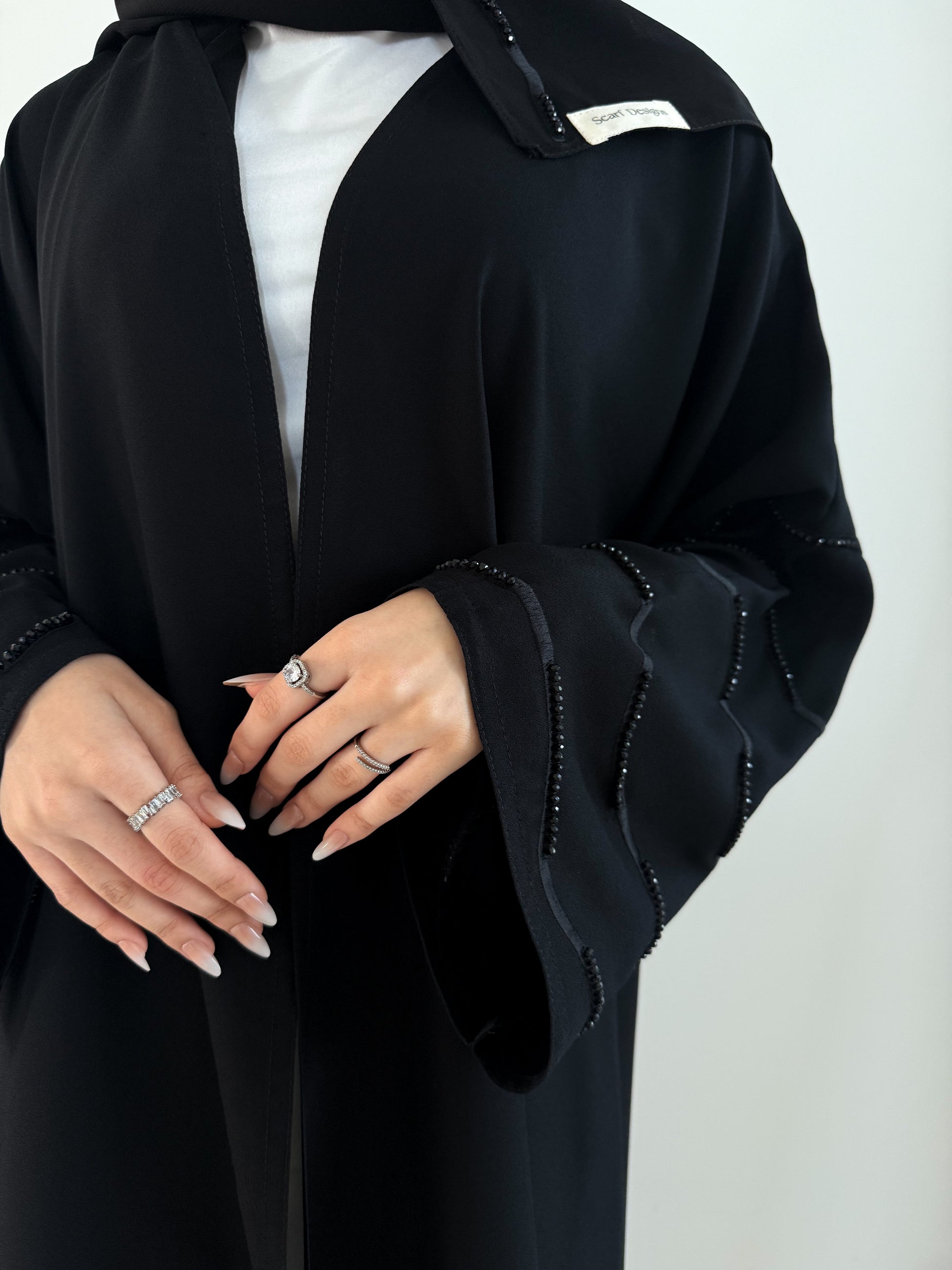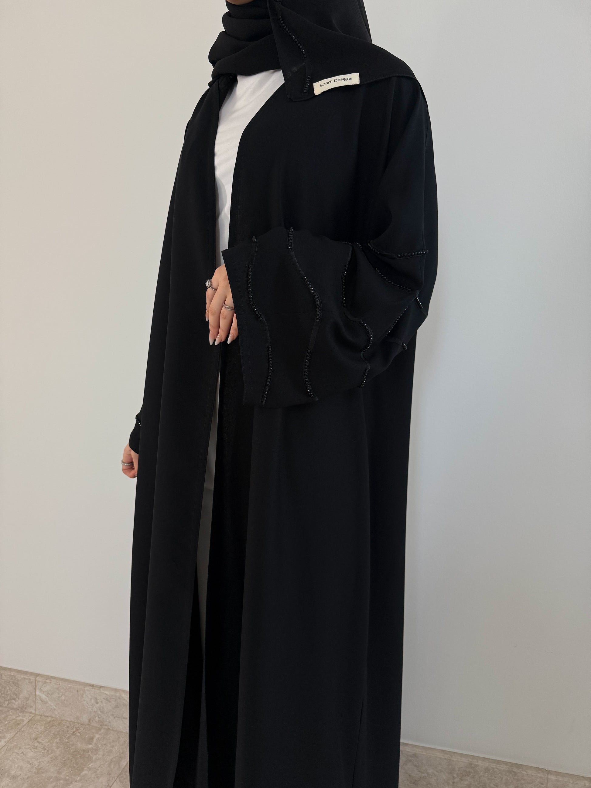عباية أنيقة و مميزة بتصميم أنيق في الكُم تطريز يدوي و شك يدوي